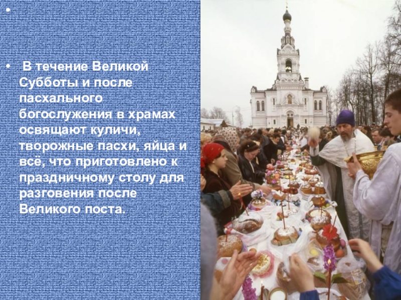 храмах освящают куличи, творожные пасхи, яйца и всё, что приготовлено к праздничному столу для разговения после Великого поста.