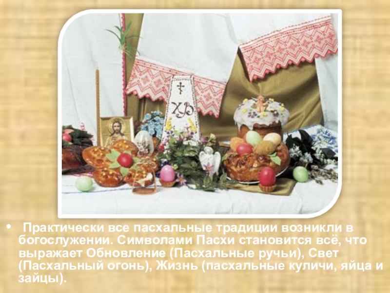 Слайд 19 Практически все пасхальные традиции возникли в богослужении. Символами Пасхи становится