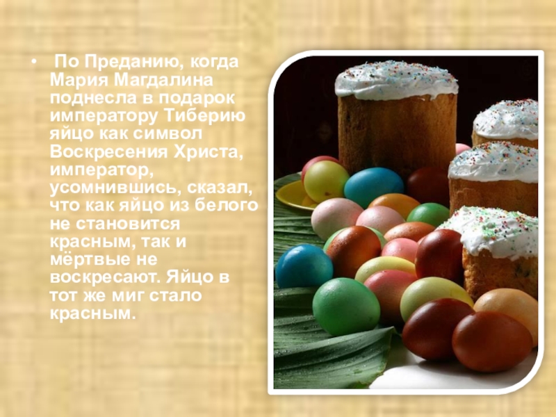 Слайд 22 По Преданию, когда Мария Магдалина поднесла в подарок императору Тиберию