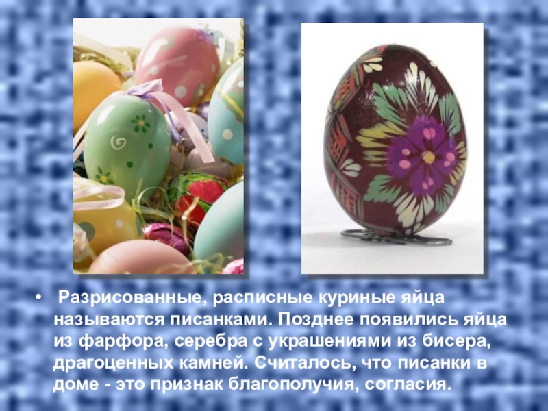Разрисованные, расписные куриные яйца называются писанками. Позднее появились яйца из фарфора, серебра с украшениями из бисера,