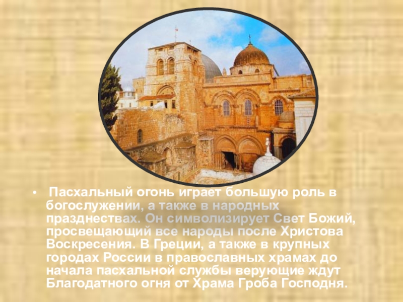 народных празднествах. Он символизирует Свет Божий, просвещающий все народы после Христова Воскресения. В Греции, а также в крупных городах России в православных храмах до начала пасхальной службы верующие ждут Благодатного огня от Храма Гроба Господня.