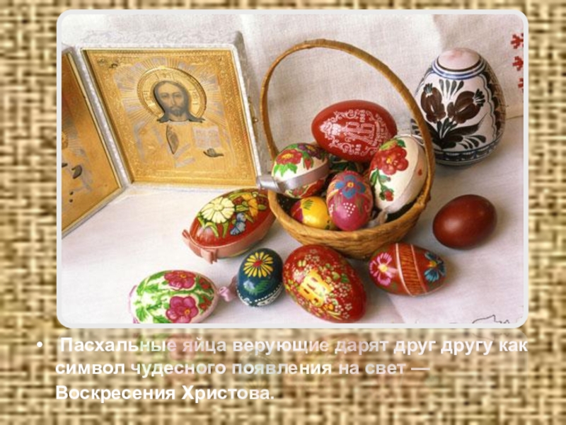 Слайд 21 Пасхальные яйца верующие дарят друг другу как символ чудесного появления
