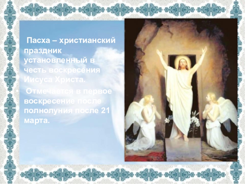 Пасха – христианский праздник установленный в честь воскресения Иисуса Христа. Отмечается в первое воскресение после полнолуния