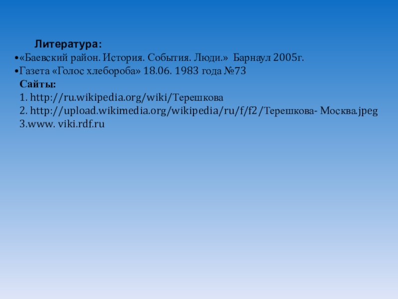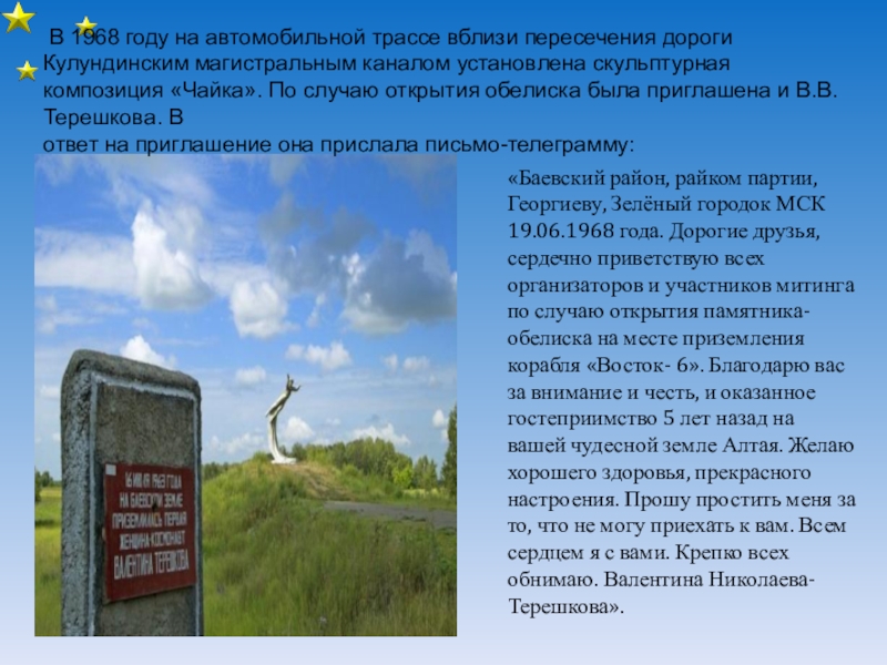 «Баевский район, райком партии, Георгиеву, Зелёный городок МСК 19.06.1968 года. Дорогие друзья, сердечно приветствую всех организаторов и участников митинга по случаю открытия памятника- обелиска на месте приземления корабля «Восток- 6». Благодарю вас за внимание и честь, и оказанное гостеприимство 5 лет назад на вашей чудесной земле Алтая. Желаю хорошего здоровья, прекрасного настроения. Прошу простить меня за то, что не могу приехать к вам. Всем сердцем я с вами. Крепко всех обнимаю. Валентина Николаева- Терешкова».
