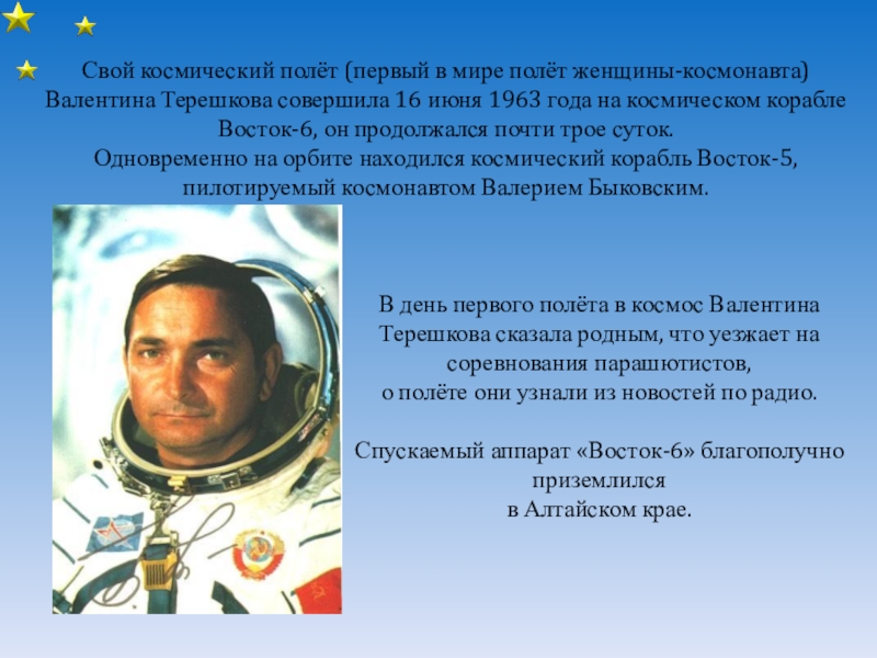 В день первого полёта в космос Валентина Терешкова сказала родным, что уезжает на соревнования парашютистов,