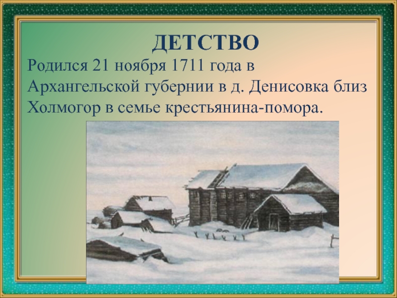 в д. Денисовка близ Холмогор в семье крестьянина-помора.