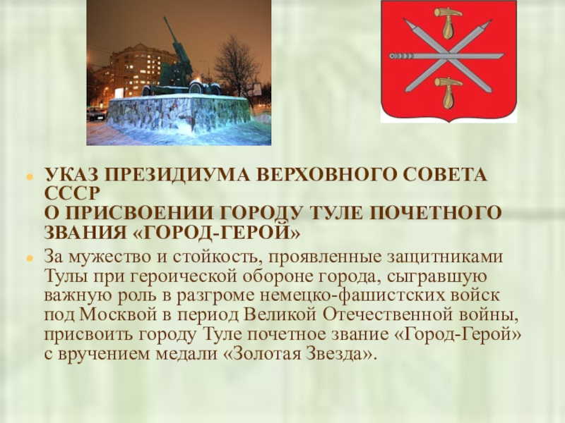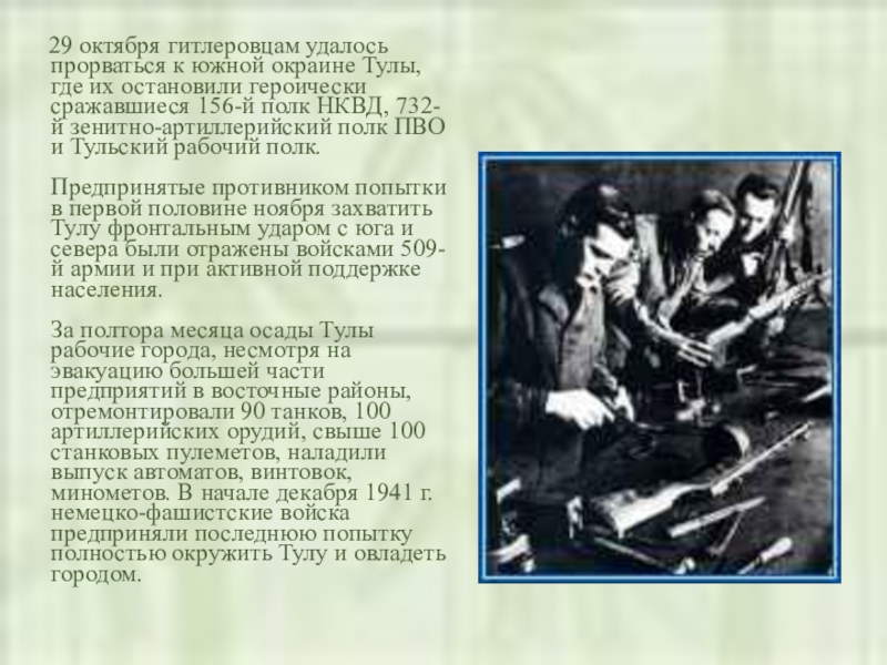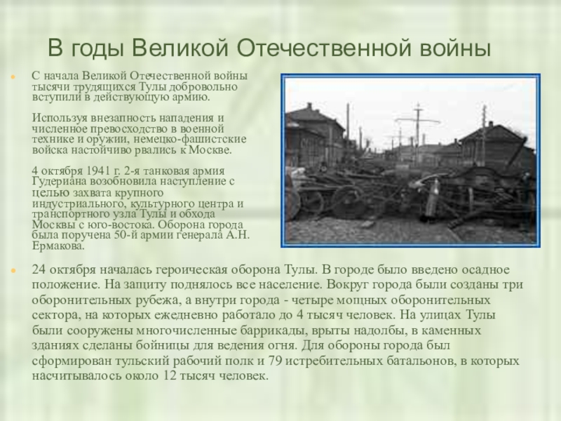 4 октября 1941 г. 2-я танковая армия Гудериана возобновила наступление с целью захвата крупного индустриального, культурного центра и транспортного узла Тулы и обхода Москвы с юго-востока. Оборона города была поручена 50-й армии генерала А.Н. Ермакова.