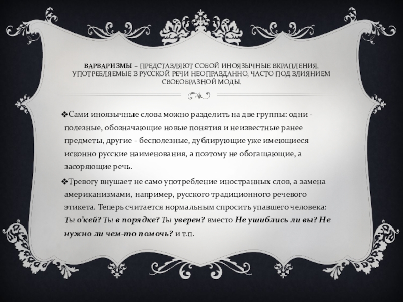 Тревогу внушает не само употребление иностранных слов, а замена американизмами, например, русского традиционного речевого этикета. Теперь считается нормальным спросить упавшего человека: Ты о’кей? Ты в порядке? Ты уверен? вместо Не ушиблись ли вы? Не нужно ли чем-то помочь? и т.п.