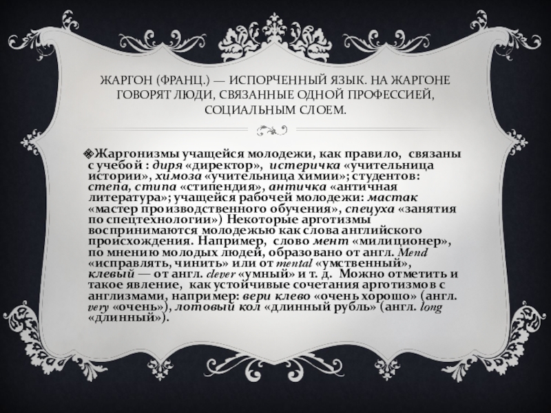 Жаргонизмы учащейся молодежи, как правило, связаны с учебой : диря «директор», истеричка «учительница истории», химоза «учительница химии»; студентов: степа, стипа «стипендия», античка «античная литература»; учащейся рабочей молодежи: мастак «мастер производственного обучения», спецуха «занятия по спецтехнологии») Некоторые арготизмы воспринимаются молодежью как слова английского происхождения. Например, слово мент «милиционер», по мнению молодых людей, образовано от англ. Mend «исправлять, чинить» или от mental «умственный», клевый — от англ. clever «умный» и т. д. Можно отметить и такое явление, как устойчивые сочетания арготизмов с англизмами, например: вери клево «очень хорошо» (англ. very «очень»), лотовый кол «длинный рубль» (англ. long «длинный»).
