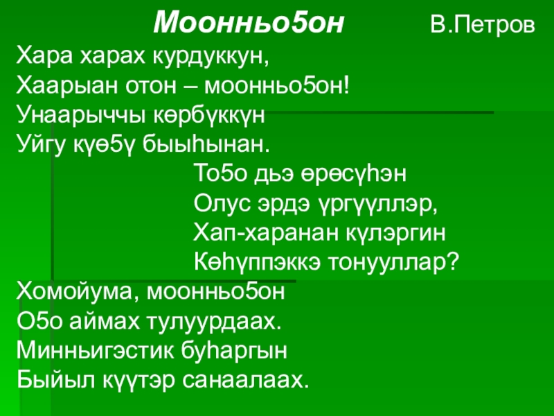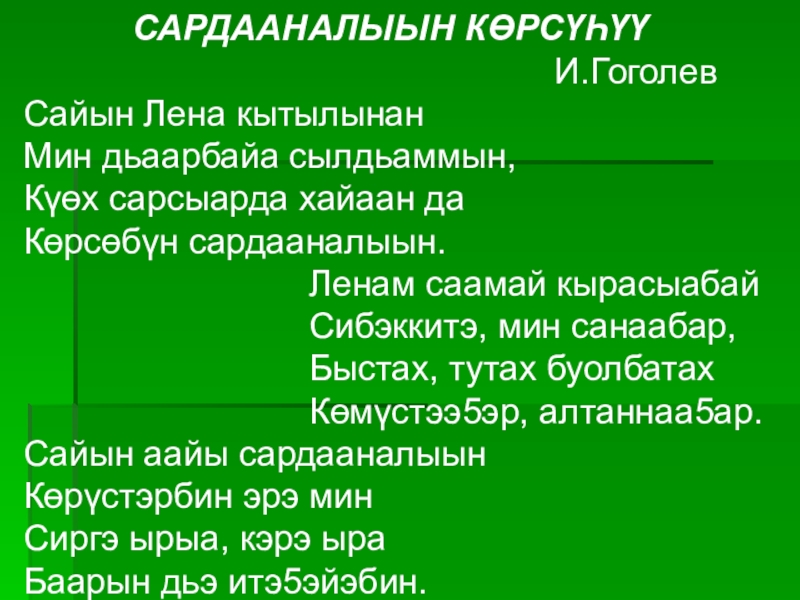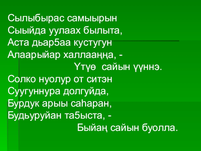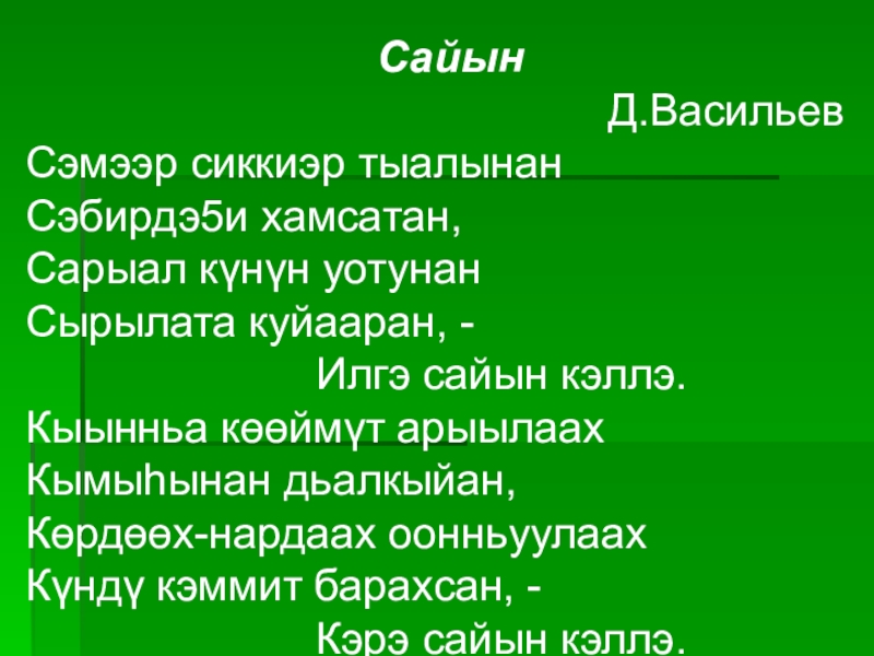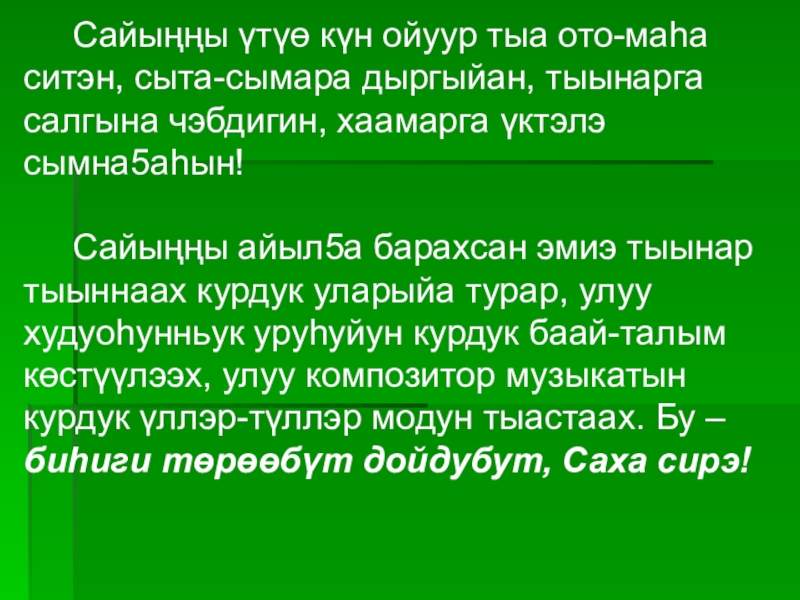 Сайыңңы айыл5а барахсан эмиэ тыынар тыыннаах курдук уларыйа турар, улуу худуоһунньук уруһуйун курдук баай-талым көстүүлээх, улуу композитор музыкатын курдук үллэр-түллэр модун тыастаах. Бу – биһиги төрөөбүт дойдубут, Саха сирэ!