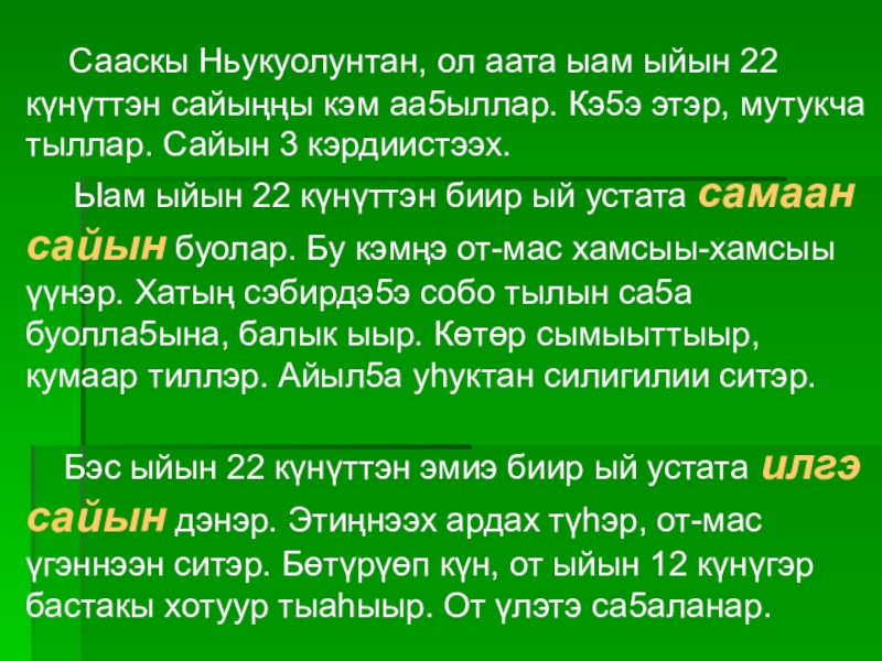 Слайд 2 Сааскы Ньукуолунтан, ол аата ыам ыйын 22 күнүттэн сайыңңы