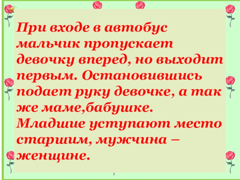 При входе в автобус мальчик пропускает девочку вперед, но выходит первым.