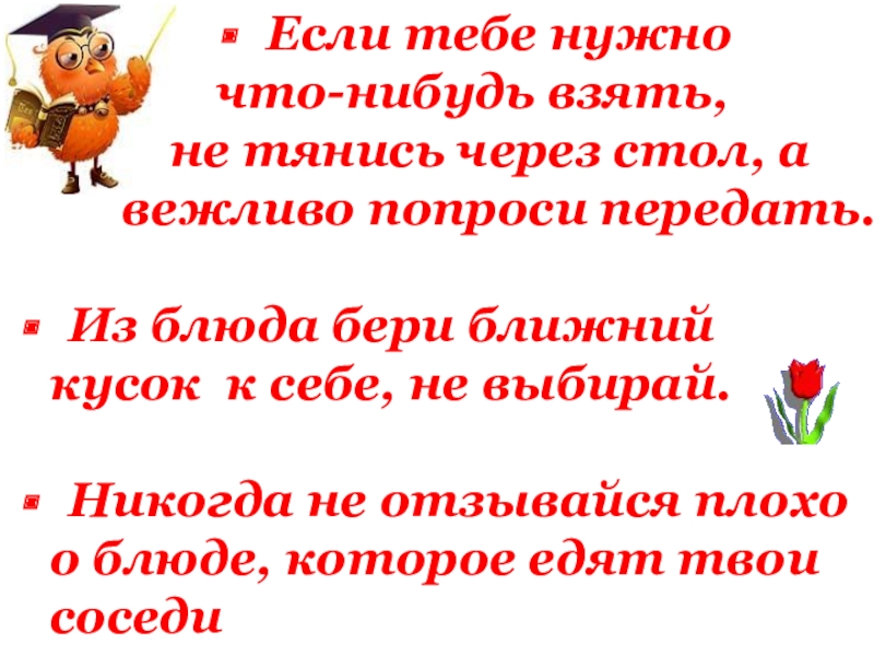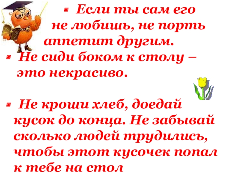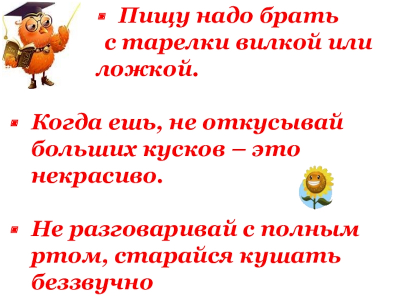 Не разговаривай с полным ртом, старайся кушать беззвучно