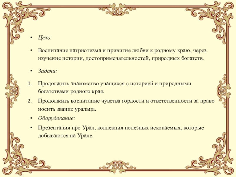Цель:Воспитание патриотизма и привитие любви к родному краю, через изучение истории, достопримечательностей, природных богатств.Задачи:Продолжить знакомство учащихся с историей и природными богатствами родного края.Продолжить воспитание чувства гордости и ответственности за право носить звание уральца.Оборудование: Презентация про Урал,