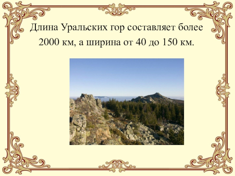 Слайд 5Длина Уральских гор cоставляет более 2000 км, а ширина от 40