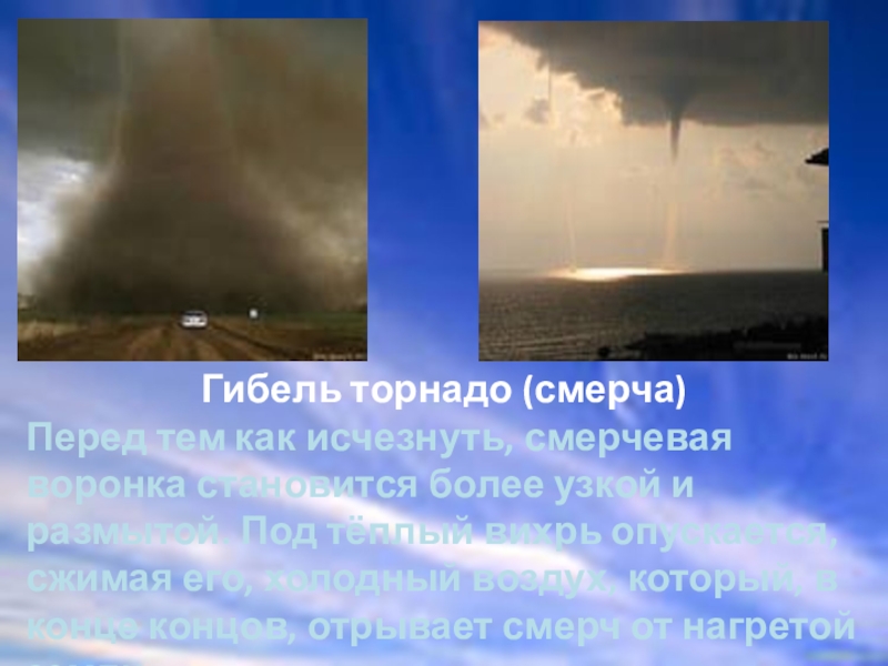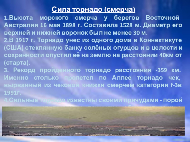 Слайд 3Торнадо (смерч) достигает размеров до 50 км по горизонтали и до
