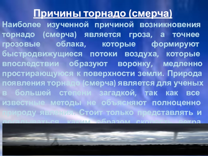 точнее грозовые облака, которые формируют быстродвижущиеся потоки воздуха, которые впоследствии образуют воронку, медленно простирающуюся к поверхности земли. Природа появления торнадо (смерча) является для ученых в большей степени загадкой, так как все известные методы не объясняют полноценно природу явления. Стоит только представлять и догадываться, каким образом скорость ветра внутри воронки торнадо (смерча) достигает нескольких сотен метров в секунду.