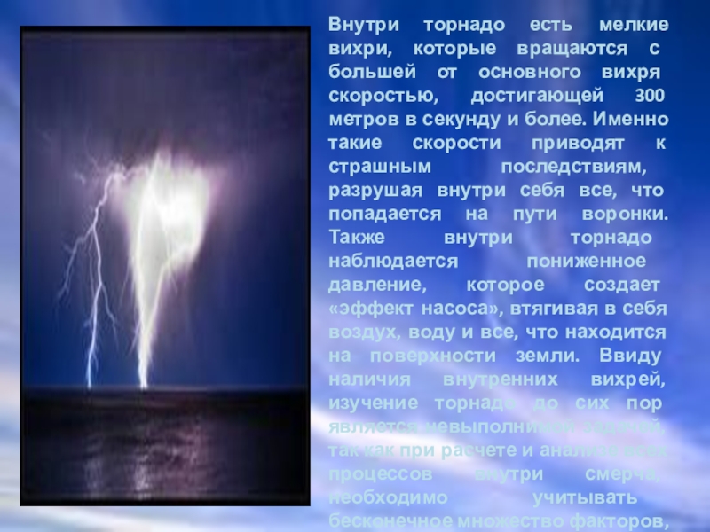вихря скоростью, достигающей 300 метров в секунду и более. Именно такие скорости приводят к страшным последствиям, разрушая внутри себя все, что попадается на пути воронки. Также внутри торнадо наблюдается пониженное давление, которое создает «эффект насоса», втягивая в себя воздух, воду и все, что находится на поверхности земли. Ввиду наличия внутренних вихрей, изучение торнадо до сих пор является невыполнимой задачей, так как при расчете и анализе всех процессов внутри смерча, необходимо учитывать бесконечное множество факторов, что практически невозможно.