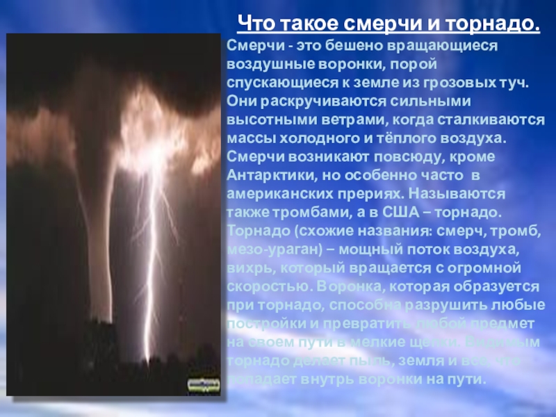 Торнадо (схожие названия: смерч, тромб, мезо-ураган) – мощный поток воздуха, вихрь, который вращается с огромной скоростью. Воронка, которая образуется при торнадо, способна разрушить любые постройки и превратить любой предмет на своем пути в мелкие щепки. Видимым торнадо делает пыль, земля и все, что попадает внутрь воронки на пути.