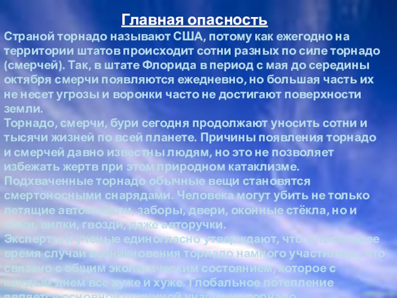 Торнадо, смерчи, бури сегодня продолжают уносить сотни и тысячи жизней по всей планете. Причины появления торнадо и смерчей давно известны людям, но это не позволяет избежать жертв при этом природном катаклизме.