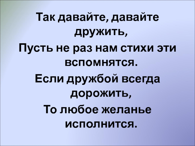 Так давайте, давайте дружить,Пусть не раз нам стихи эти вспомнятся.Если дружбой всегда дорожить,То любое желанье исполнится.