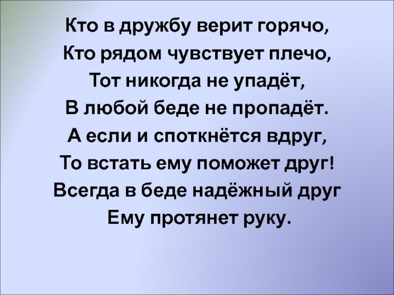 Кто в дружбу верит горячо,Кто рядом чувствует плечо,Тот никогда не упадёт,В любой беде не пропадёт.А если и