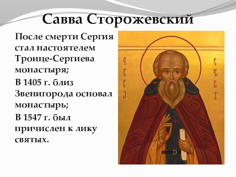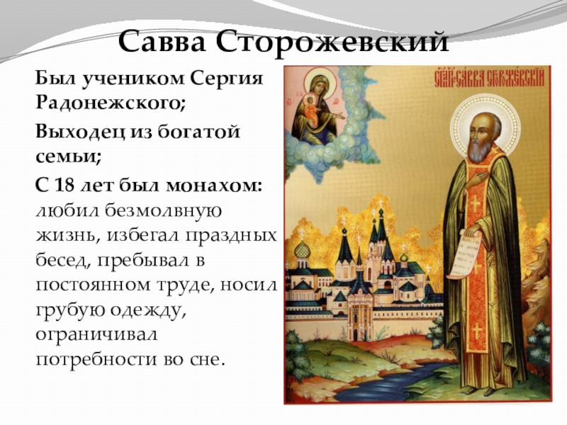 преподобный Савва Сторожевский, ученик преподобного Сергия Радонежского. Будущий великий святой пришёл в обитель преподобного Сергия совсем юным. Ему было не более 18 лет, когда он принял монашеский постриг. Это было около 1345 года.
