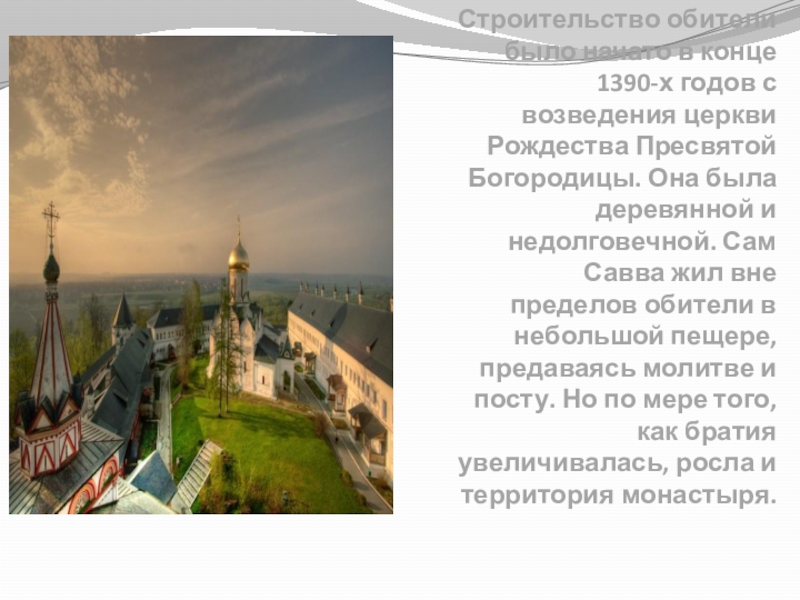 Рождества Пресвятой Богородицы. Она была деревянной и недолговечной. Сам Савва жил вне пределов обители в небольшой пещере, предаваясь молитве и посту. Но по мере того, как братия увеличивалась, росла и территория монастыря.