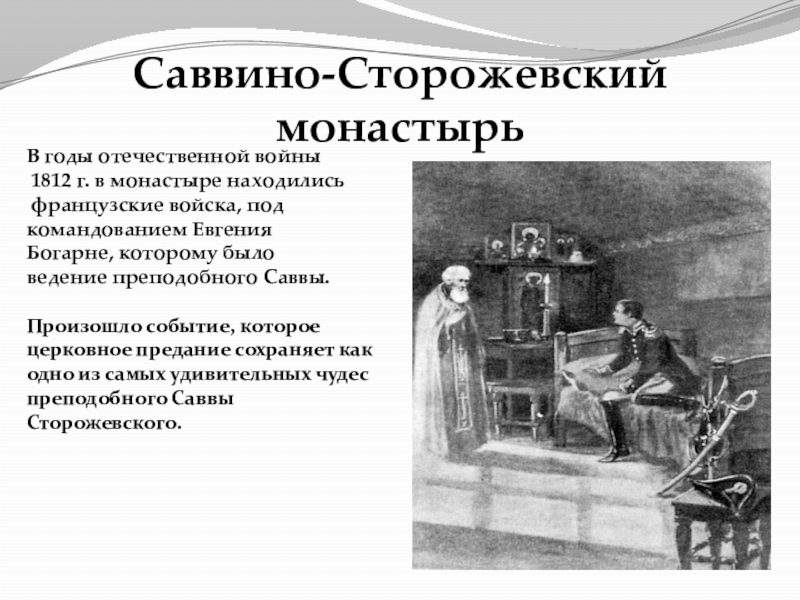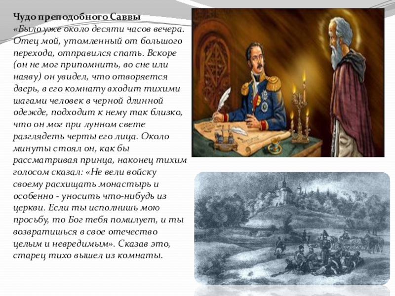 от большого перехода, отправился спать. Вскоре (он не мог припомнить, во сне или наяву) он увидел, что отворяется дверь, в его комнату входит тихими шагами человек в черной длинной одежде, подходит к нему так близко, что он мог при лунном свете разглядеть черты его лица. Около минуты стоял он, как бы рассматривая принца, наконец тихим голосом сказал: «Не вели войску своему расхищать монастырь и особенно - уносить что-нибудь из церкви. Если ты исполнишь мою просьбу, то Бог тебя помилует, и ты возвратишься в свое отечество целым и невредимым». Сказав это, старец тихо вышел из комнаты.