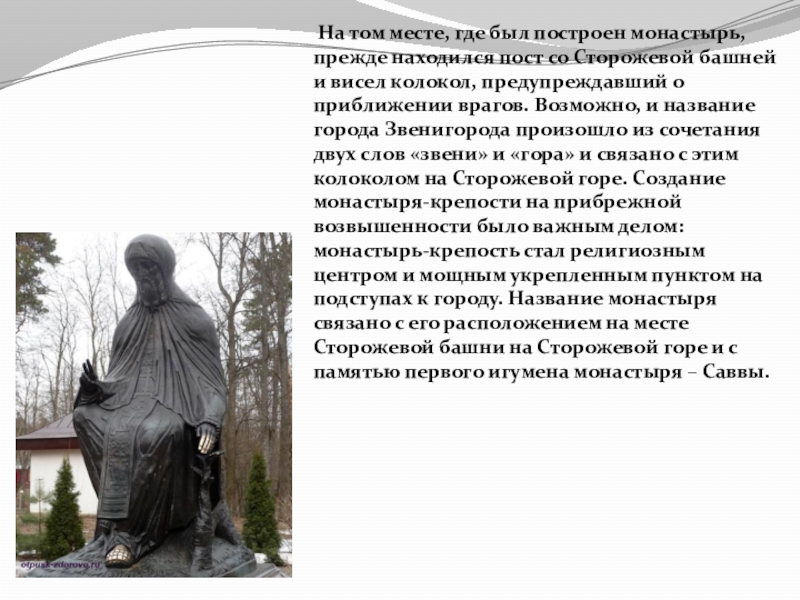 Сторожевой башней и висел колокол, предупреждавший о приближении врагов. Возможно, и название города Звенигорода произошло из сочетания двух слов «звени» и «гора» и связано с этим колоколом на Сторожевой горе. Создание монастыря-крепости на прибрежной возвышенности было важным делом: монастырь-крепость стал религиозным центром и мощным укрепленным пунктом на подступах к городу. Название монастыря связано с его расположением на месте Сторожевой башни на Сторожевой горе и с памятью первого игумена монастыря – Саввы.