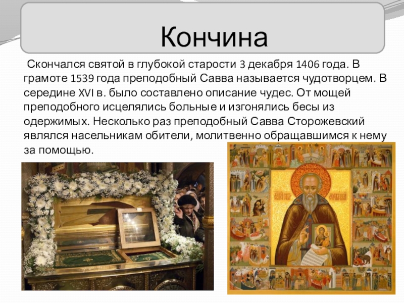 Скончался святой в глубокой старости 3 декабря 1406 года. В грамоте 1539 года преподобный Савва называется чудотворцем. В середине XVI в. было составлено описание чудес. От мощей преподобного исцелялись больные и изгонялись бесы из одержимых. Несколько раз преподобный Савва Сторожевский являлся насельникам обители, молитвенно обращавшимся к нему за помощью.