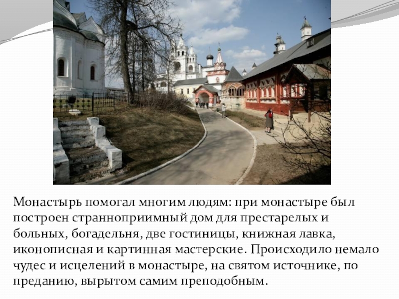 Слайд 17Монастырь помогал многим людям: при монастыре был построен странноприимный дом для