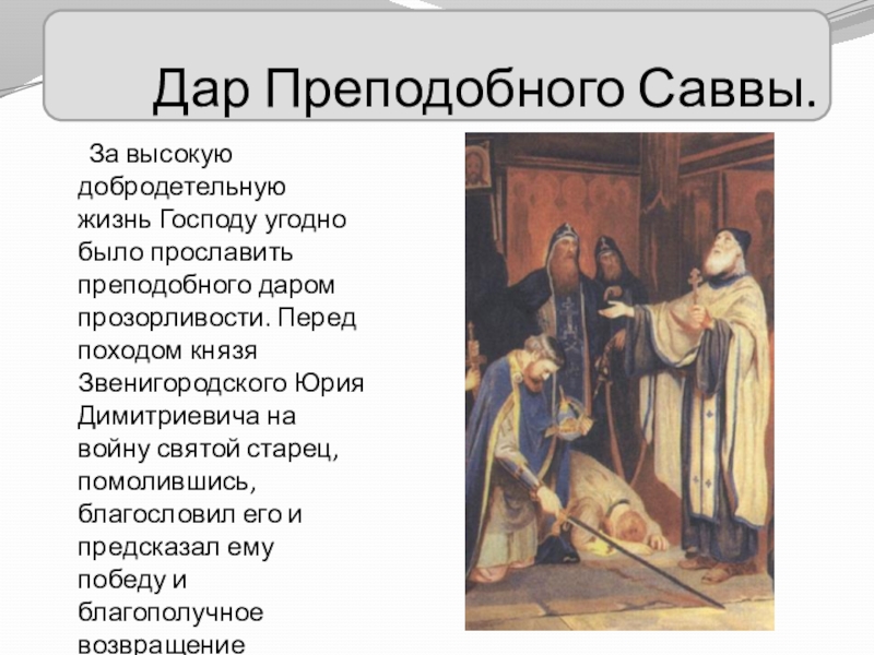 высокую добродетельную жизнь Господу угодно было прославить преподобного даром прозорливости. Перед походом князя Звенигородского Юрия Димитриевича на войну святой старец, помолившись, благословил его и предсказал ему победу и благополучное возвращение