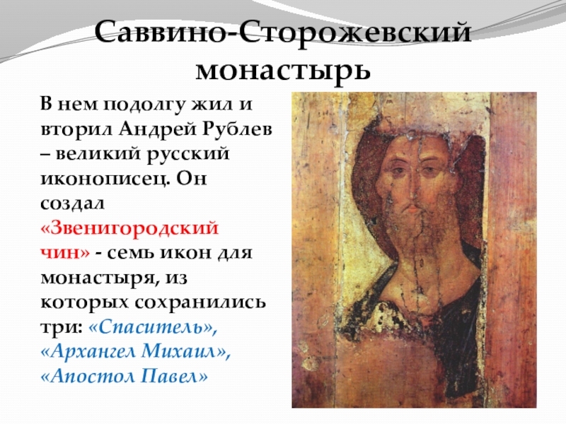 – великий русский иконописец. Он создал «Звенигородский чин» - семь икон для монастыря, из которых сохранились три: «Спаситель», «Архангел Михаил», «Апостол Павел»