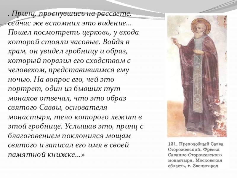 посмотреть церковь, у входа которой стояли часовые. Войдя в храм, он увидел гробницу и образ, который поразил его сходством с человеком, представившимся ему ночью. На вопрос его, чей это портрет, один из бывших тут монахов отвечал, что это образ святого Саввы, основателя монастыря, тело которого лежит в этой гробнице. Услышав это, принц с благоговением поклонился мощам святого и записал его имя в своей памятной книжке...»