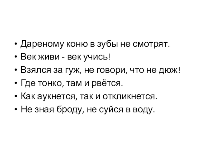 Дареному коню в зубы не смотрят.Век живи - век учись!Взялся за гуж, не говори, что не дюж!Где