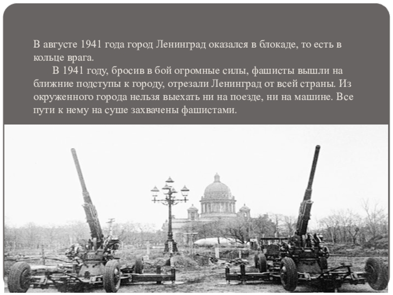 В августе 1941 года город Ленинград оказался в блокаде, то есть в кольце врага.        В 1941