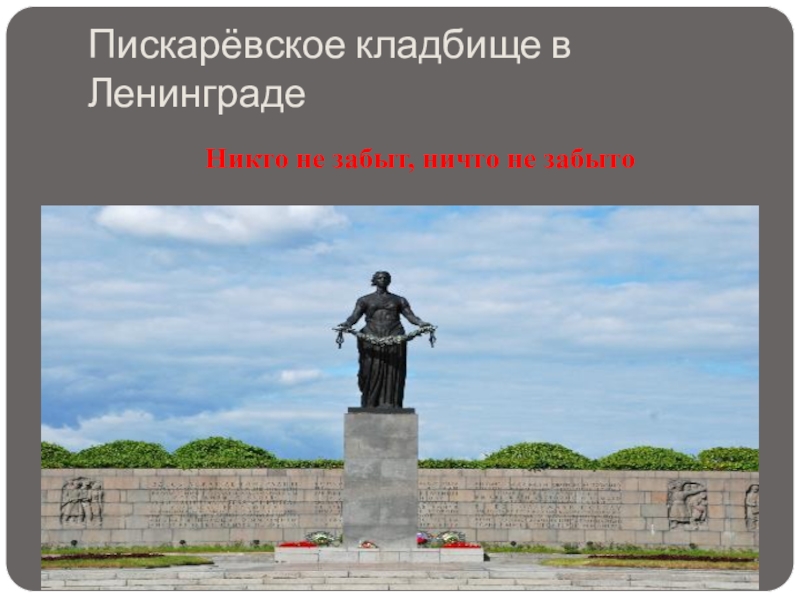 Пискарёвское кладбище в Ленинграде Никто не забыт, ничто не забыто