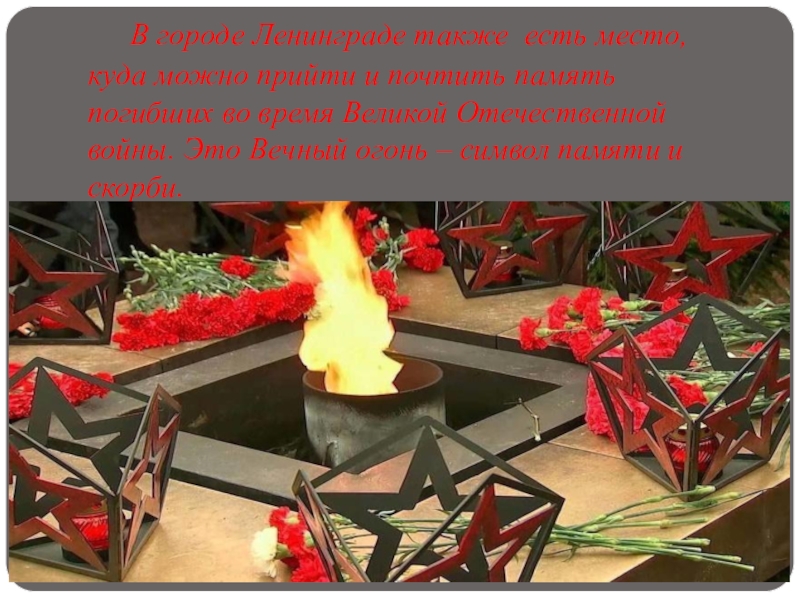 почтить память погибших во время Великой Отечественной войны. Это Вечный огонь – символ памяти и скорби.