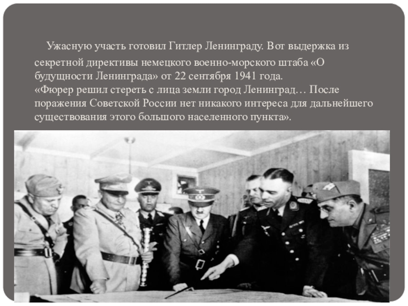 Слайд 4    Ужасную участь готовил Гитлер Ленинграду. Вот выдержка из секретной директивы немецкого