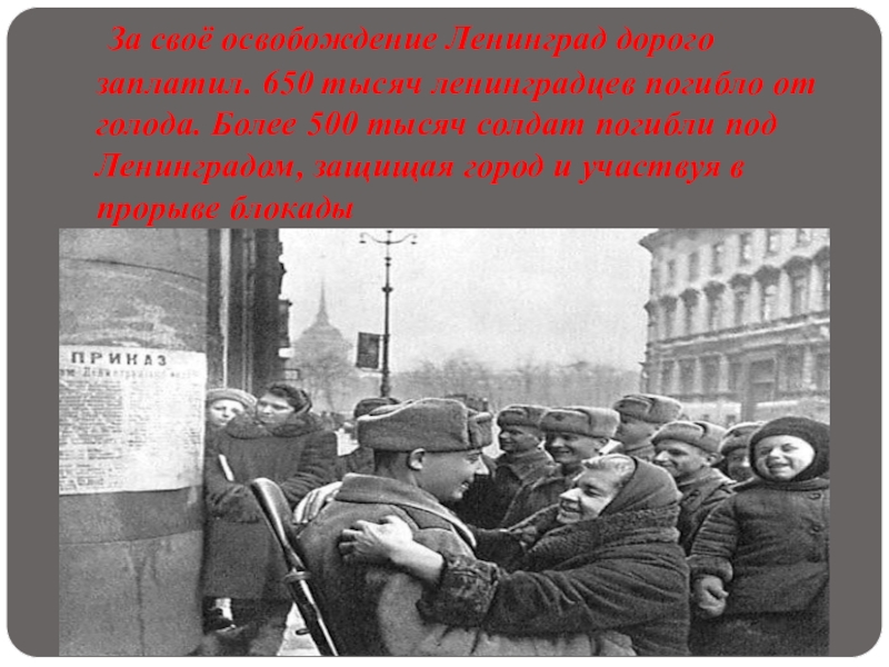 Слайд 15 За своё освобождение Ленинград дорого заплатил. 650 тысяч ленинградцев погибло от