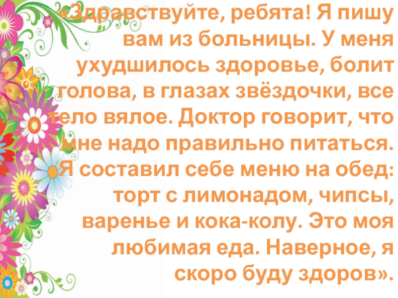 Слайд 6«Здравствуйте, ребята! Я пишу вам из больницы. У меня ухудшилось здоровье,