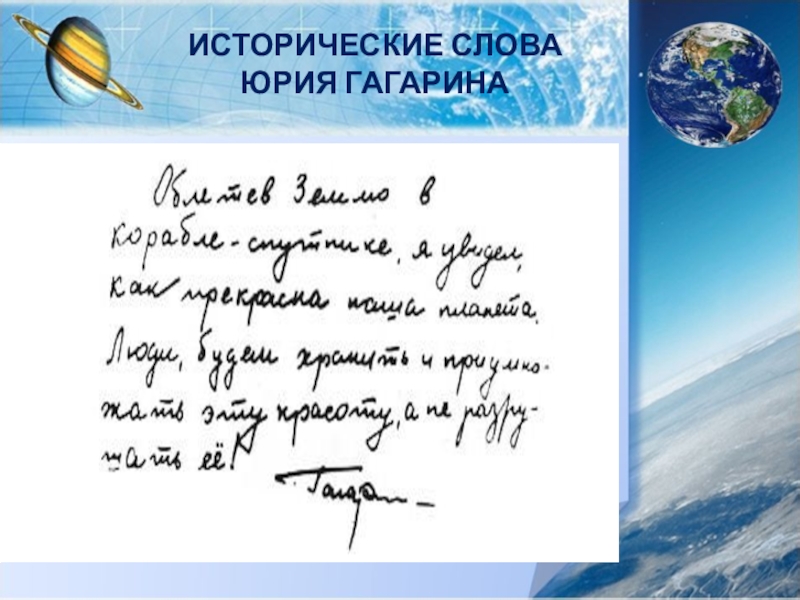 Слайд 6ИСТОРИЧЕСКИЕ СЛОВА ЮРИЯ ГАГАРИНА