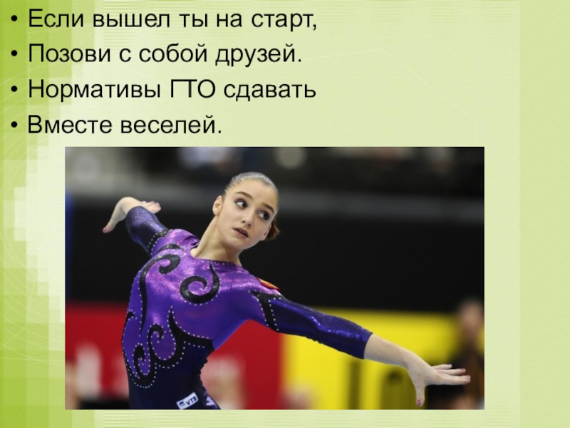 Если вышел ты на старт,Позови с собой друзей.Нормативы ГТО сдаватьВместе веселей.