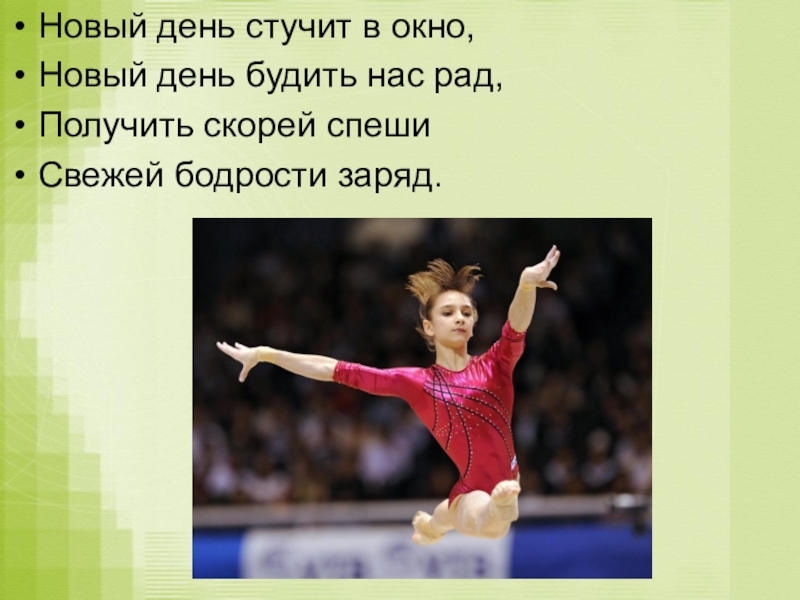 Новый день стучит в окно,Новый день будить нас рад,Получить скорей спешиСвежей бодрости заряд.