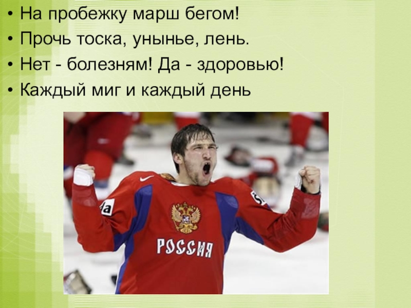 На пробежку марш бегом!Прочь тоска, унынье, лень.Нет - болезням! Да - здоровью!Каждый миг и каждый день
