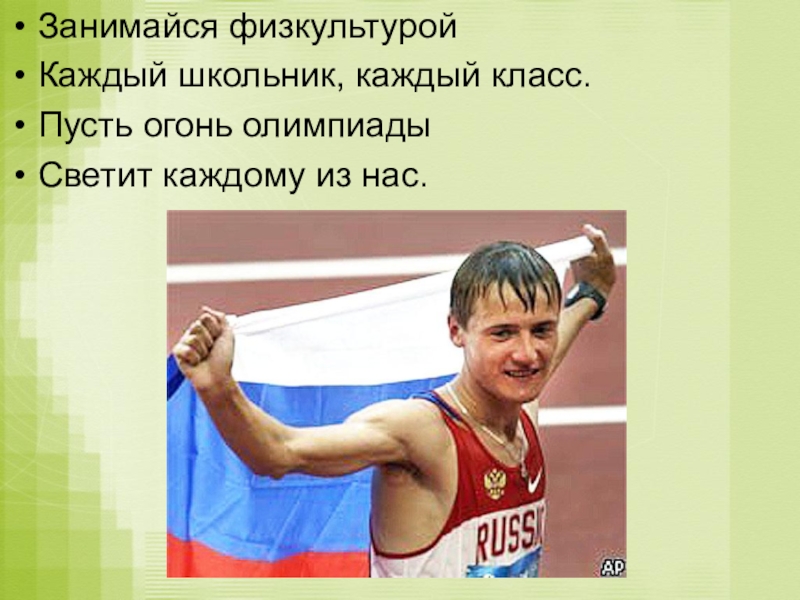 Занимайся физкультуройКаждый школьник, каждый класс.Пусть огонь олимпиадыСветит каждому из нас.
