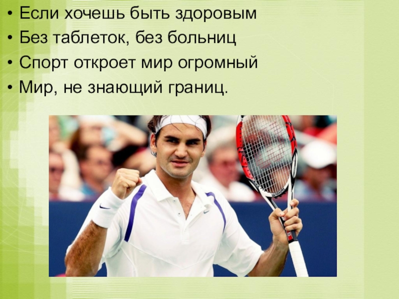 Если хочешь быть здоровымБез таблеток, без больницСпорт откроет мир огромныйМир, не знающий границ.
