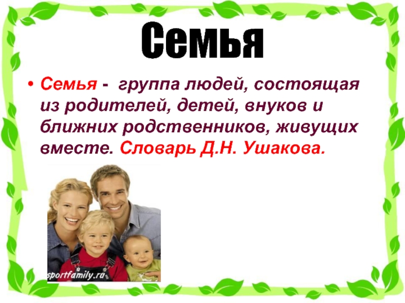 Семья - группа людей, состоящая из родителей, детей, внуков и ближних