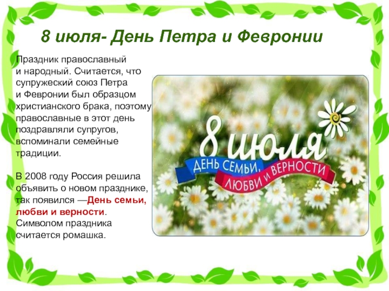 В 2008 году Россия решила объявить о новом празднике, так появился —День семьи, любви и верности. Символом праздника считается ромашка.